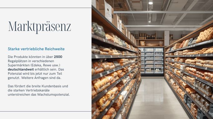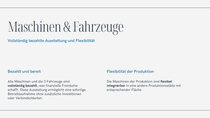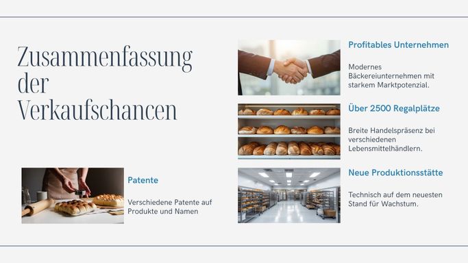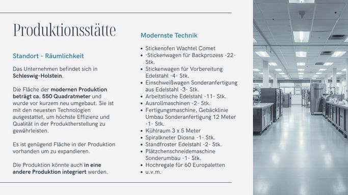 • Kein Meistertitel notwendig (Bezeichnung als kleiner Industriebetrieb) • keine Maklerprovision für den Käufer • Verkauf der Patente, Rezepte, 2500 Regalplätze im Leh und des gesamten Inventars • In eine andere Lebensmittelproduktion integrierbar • Neue Produktion (gemietet) ist auf Expansion ausgelegt • Expansionskonzept liegt vor • 530.000 Euro (MwSt. frei)